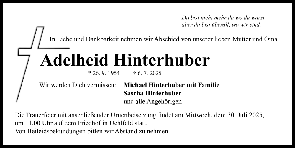 Hier finden Sie alle Traueranzeigen aus der Zeitung, die bisher für Adelheid Hinterhuber erschienen sind. Weitere Traueranzeigen, die in der Zeitung erscheinen, werden hier ebenfalls aufgelistet