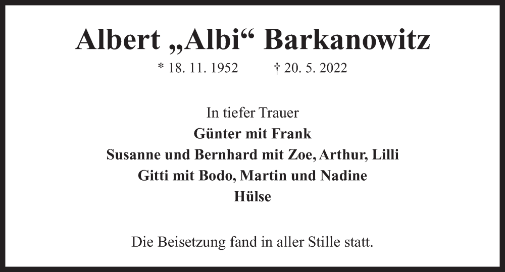 Hier finden Sie alle Traueranzeigen aus der Zeitung, die bisher für Albert Barkanowitz erschienen sind. Weitere Traueranzeigen, die in der Zeitung erscheinen, werden hier ebenfalls aufgelistet