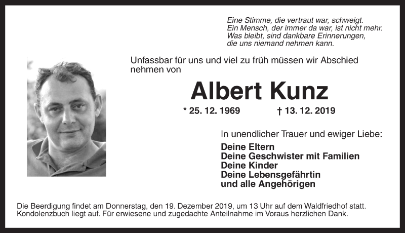 Hier finden Sie alle Traueranzeigen aus der Zeitung, die bisher für Albert Kunz erschienen sind. Weitere Traueranzeigen, die in der Zeitung erscheinen, werden hier ebenfalls aufgelistet