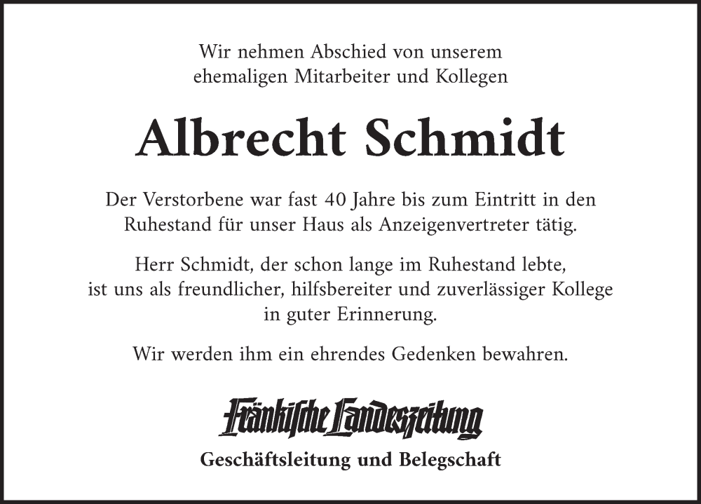Hier finden Sie alle Traueranzeigen aus der Zeitung, die bisher für Albrecht Schmidt erschienen sind. Weitere Traueranzeigen, die in der Zeitung erscheinen, werden hier ebenfalls aufgelistet
