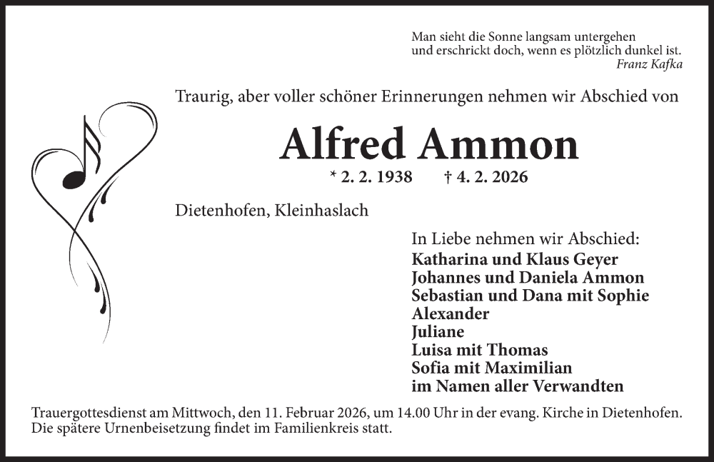 Hier finden Sie alle Traueranzeigen aus der Zeitung, die bisher für Alfred Ammon erschienen sind. Weitere Traueranzeigen, die in der Zeitung erscheinen, werden hier ebenfalls aufgelistet