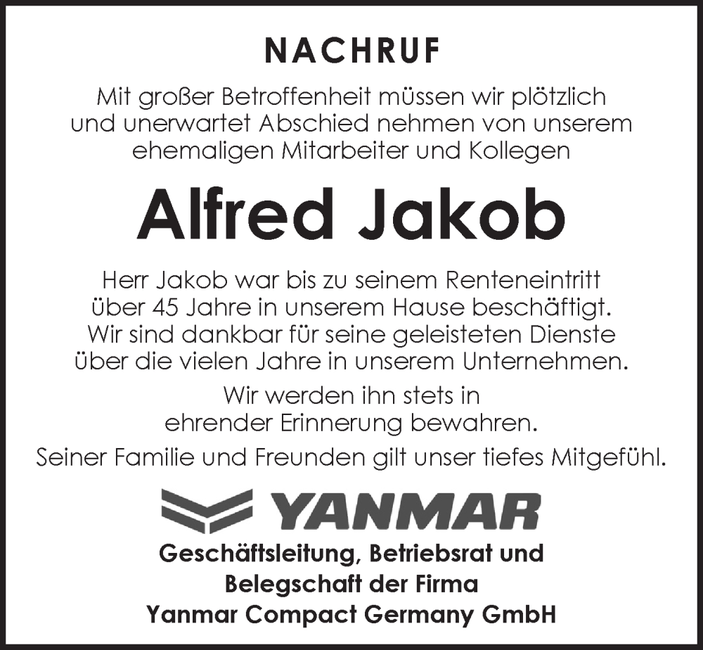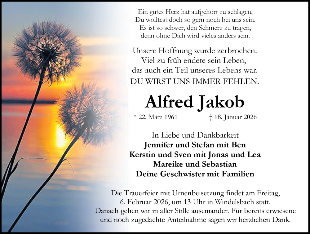 Hier finden Sie alle Traueranzeigen aus der Zeitung, die bisher für Alfred Jakob erschienen sind. Weitere Traueranzeigen, die in der Zeitung erscheinen, werden hier ebenfalls aufgelistet