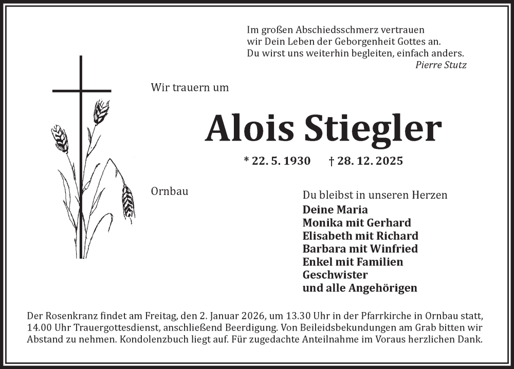 Hier finden Sie alle Traueranzeigen aus der Zeitung, die bisher für Alois Stiegler erschienen sind. Weitere Traueranzeigen, die in der Zeitung erscheinen, werden hier ebenfalls aufgelistet