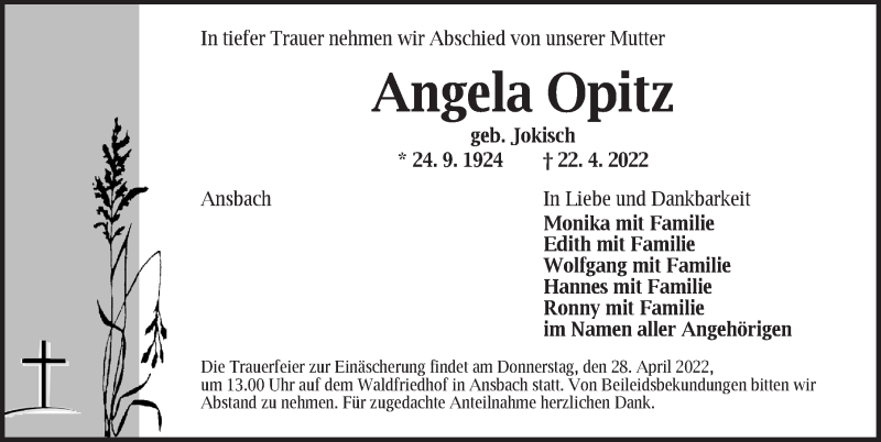 Hier finden Sie alle Traueranzeigen aus der Zeitung, die bisher für Angela Opitz erschienen sind. Weitere Traueranzeigen, die in der Zeitung erscheinen, werden hier ebenfalls aufgelistet