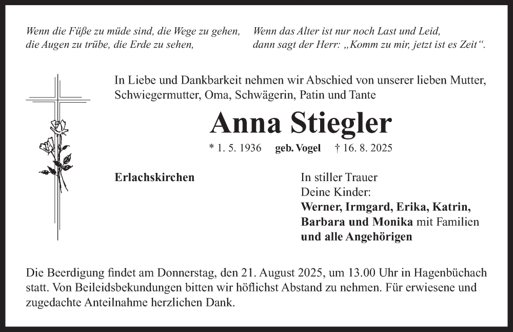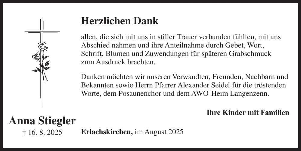 Hier finden Sie alle Traueranzeigen aus der Zeitung, die bisher für Anna Stiegler erschienen sind. Weitere Traueranzeigen, die in der Zeitung erscheinen, werden hier ebenfalls aufgelistet