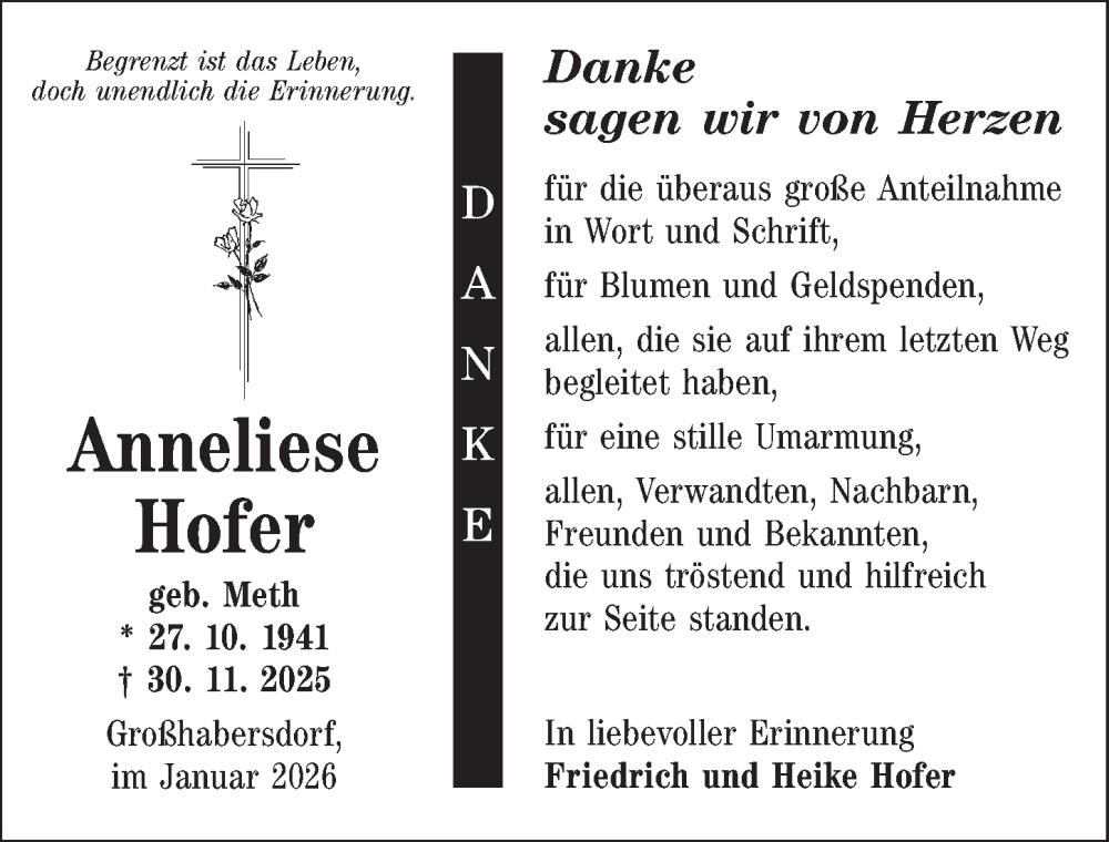 Hier finden Sie alle Traueranzeigen aus der Zeitung, die bisher für Anneliese Hofer erschienen sind. Weitere Traueranzeigen, die in der Zeitung erscheinen, werden hier ebenfalls aufgelistet