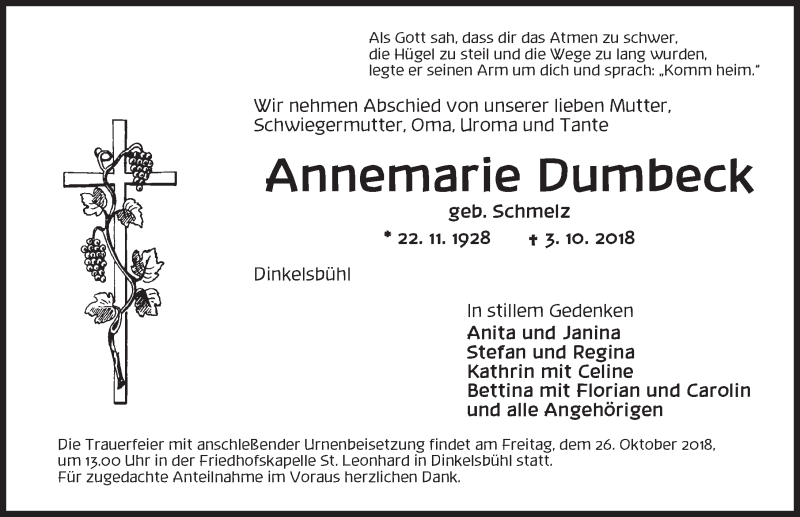 Hier finden Sie alle Traueranzeigen aus der Zeitung, die bisher für Annemarie Dumbeck erschienen sind. Weitere Traueranzeigen, die in der Zeitung erscheinen, werden hier ebenfalls aufgelistet