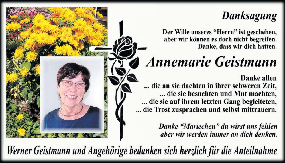 Hier finden Sie alle Traueranzeigen aus der Zeitung, die bisher für Annemarie Geistmann erschienen sind. Weitere Traueranzeigen, die in der Zeitung erscheinen, werden hier ebenfalls aufgelistet