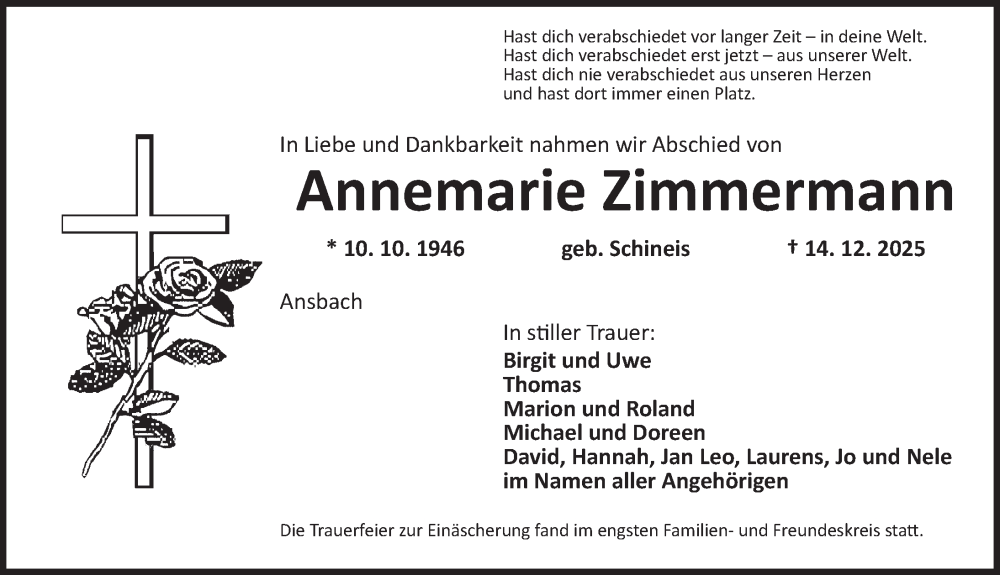 Hier finden Sie alle Traueranzeigen aus der Zeitung, die bisher für Annemarie Zimmermann erschienen sind. Weitere Traueranzeigen, die in der Zeitung erscheinen, werden hier ebenfalls aufgelistet
