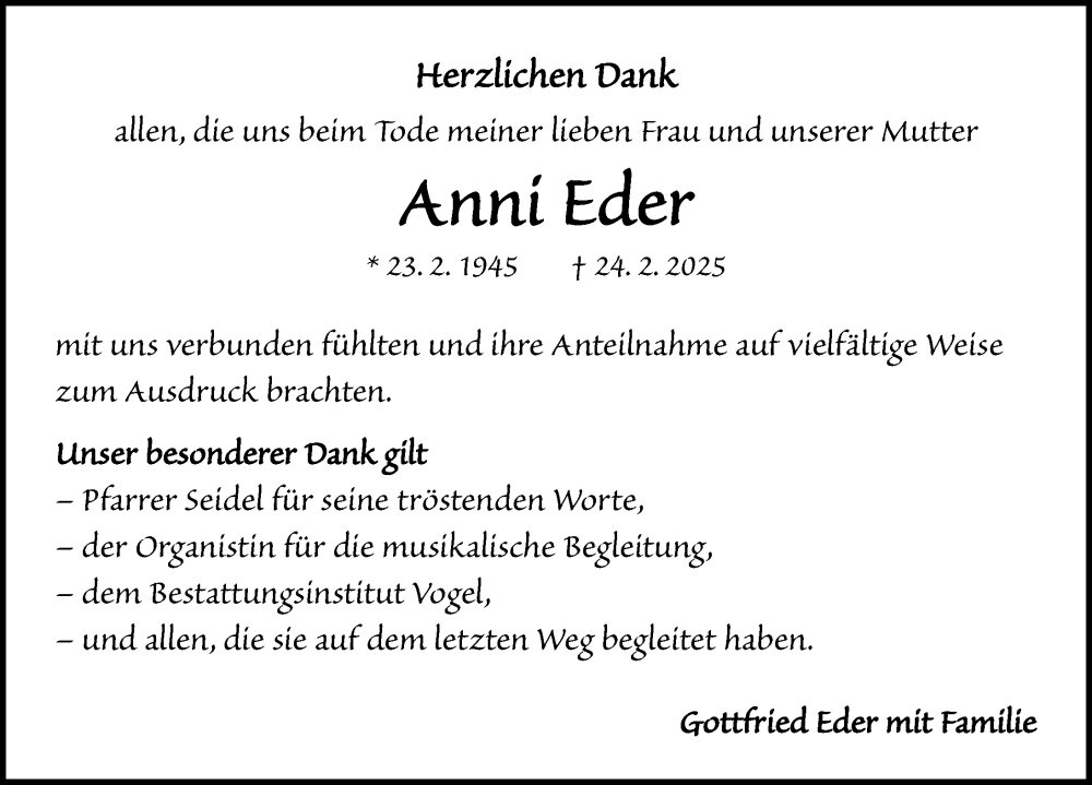 Hier finden Sie alle Traueranzeigen aus der Zeitung, die bisher für Anni Eder erschienen sind. Weitere Traueranzeigen, die in der Zeitung erscheinen, werden hier ebenfalls aufgelistet