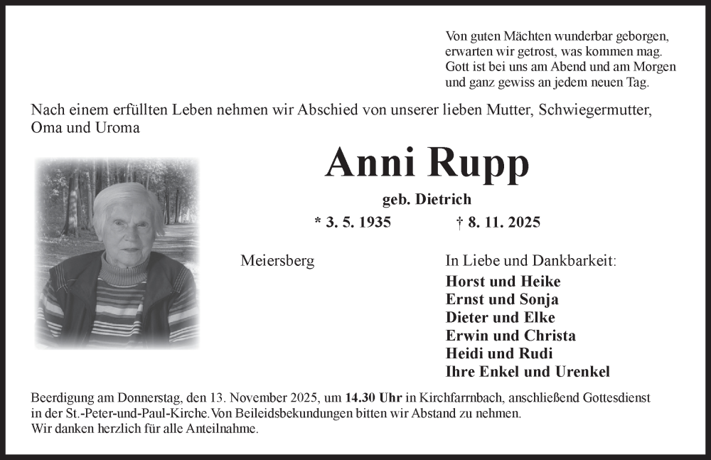 Hier finden Sie alle Traueranzeigen aus der Zeitung, die bisher für Anni Rupp erschienen sind. Weitere Traueranzeigen, die in der Zeitung erscheinen, werden hier ebenfalls aufgelistet