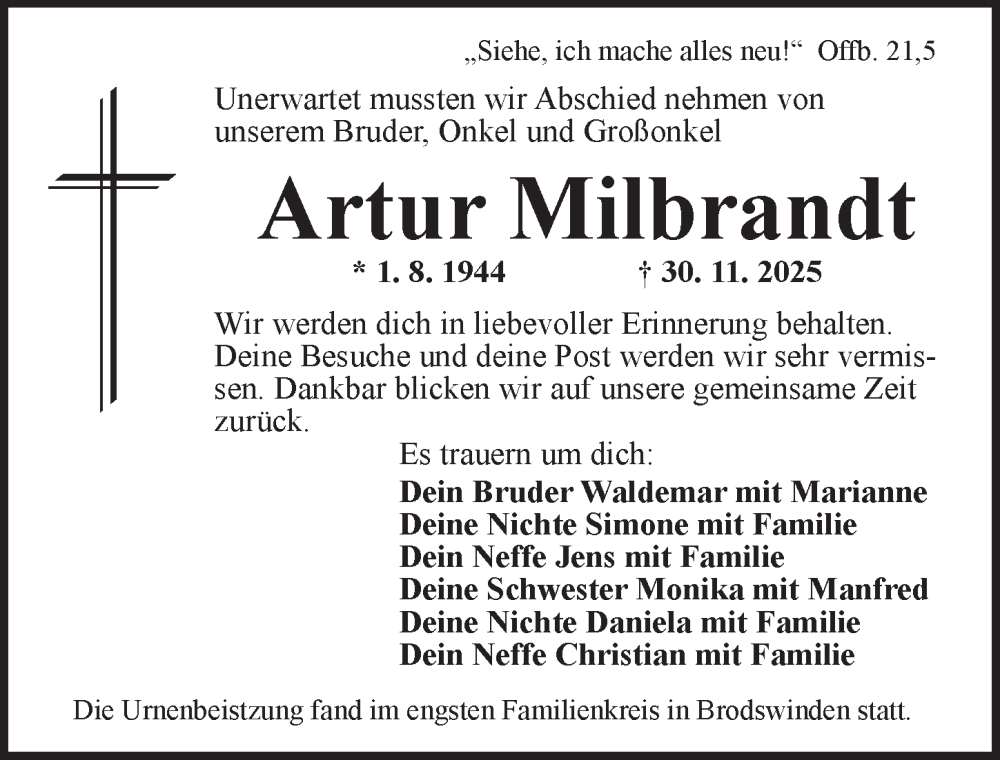 Hier finden Sie alle Traueranzeigen aus der Zeitung, die bisher für Artur Milbrandt erschienen sind. Weitere Traueranzeigen, die in der Zeitung erscheinen, werden hier ebenfalls aufgelistet