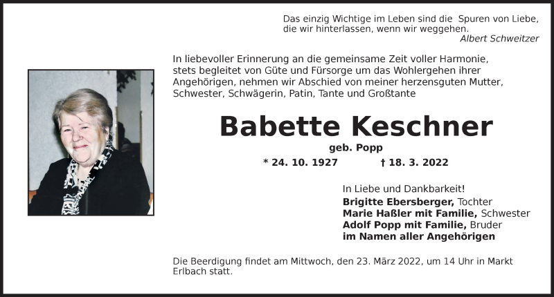 Hier finden Sie alle Traueranzeigen aus der Zeitung, die bisher für Babette Keschner erschienen sind. Weitere Traueranzeigen, die in der Zeitung erscheinen, werden hier ebenfalls aufgelistet