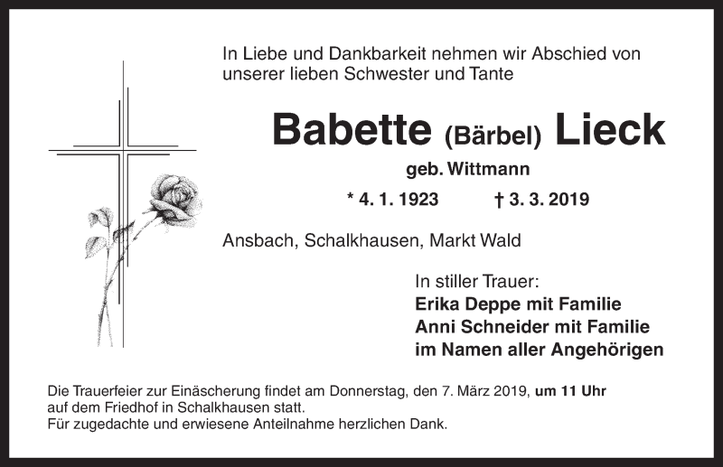 Hier finden Sie alle Traueranzeigen aus der Zeitung, die bisher für Babette Bärbel Lieck erschienen sind. Weitere Traueranzeigen, die in der Zeitung erscheinen, werden hier ebenfalls aufgelistet