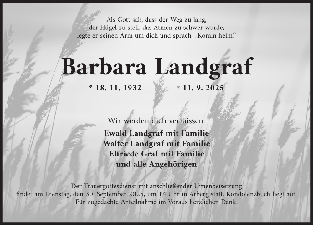 Hier finden Sie alle Traueranzeigen aus der Zeitung, die bisher für Barbara Landgraf erschienen sind. Weitere Traueranzeigen, die in der Zeitung erscheinen, werden hier ebenfalls aufgelistet