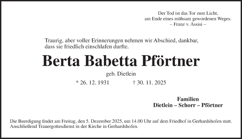 Hier finden Sie alle Traueranzeigen aus der Zeitung, die bisher für Berta Babetta Pförtner erschienen sind. Weitere Traueranzeigen, die in der Zeitung erscheinen, werden hier ebenfalls aufgelistet