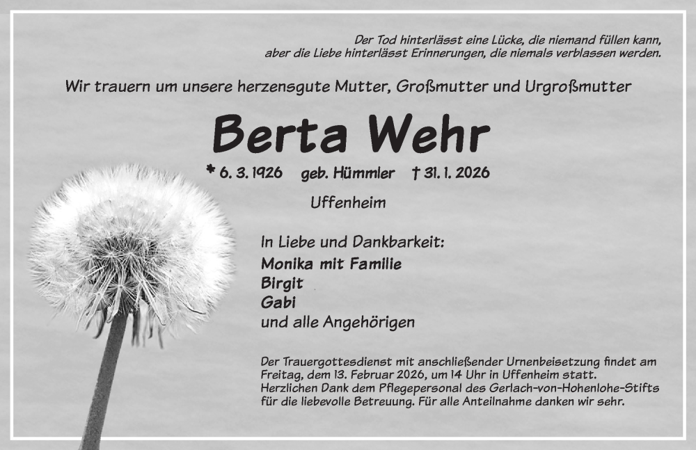 Hier finden Sie alle Traueranzeigen aus der Zeitung, die bisher für Berta Wehr erschienen sind. Weitere Traueranzeigen, die in der Zeitung erscheinen, werden hier ebenfalls aufgelistet