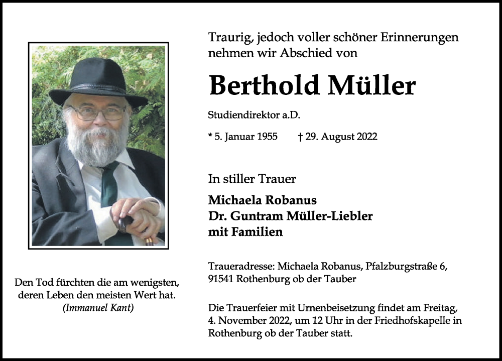 Hier finden Sie alle Traueranzeigen aus der Zeitung, die bisher für Berthold Müller erschienen sind. Weitere Traueranzeigen, die in der Zeitung erscheinen, werden hier ebenfalls aufgelistet