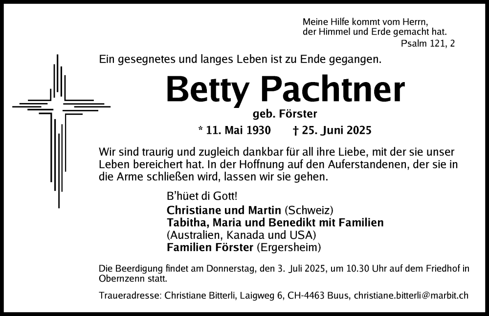 Hier finden Sie alle Traueranzeigen aus der Zeitung, die bisher für Betty Pachtner erschienen sind. Weitere Traueranzeigen, die in der Zeitung erscheinen, werden hier ebenfalls aufgelistet