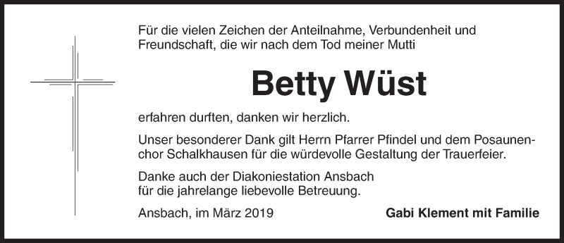 Hier finden Sie alle Traueranzeigen aus der Zeitung, die bisher für Betty Wüst erschienen sind. Weitere Traueranzeigen, die in der Zeitung erscheinen, werden hier ebenfalls aufgelistet
