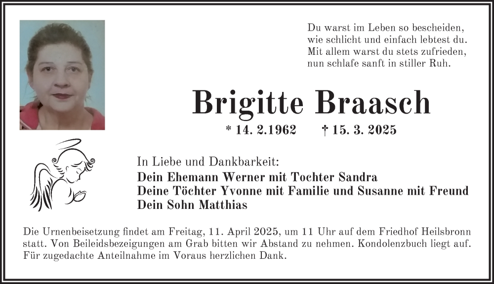 Hier finden Sie alle Traueranzeigen aus der Zeitung, die bisher für Brigitte Braasch erschienen sind. Weitere Traueranzeigen, die in der Zeitung erscheinen, werden hier ebenfalls aufgelistet