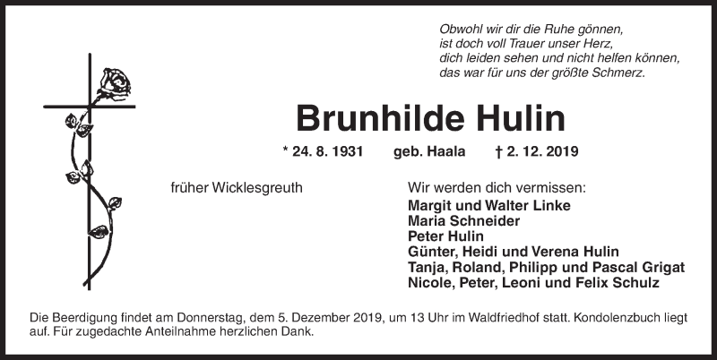 Hier finden Sie alle Traueranzeigen aus der Zeitung, die bisher für Brunhilde Hulin erschienen sind. Weitere Traueranzeigen, die in der Zeitung erscheinen, werden hier ebenfalls aufgelistet