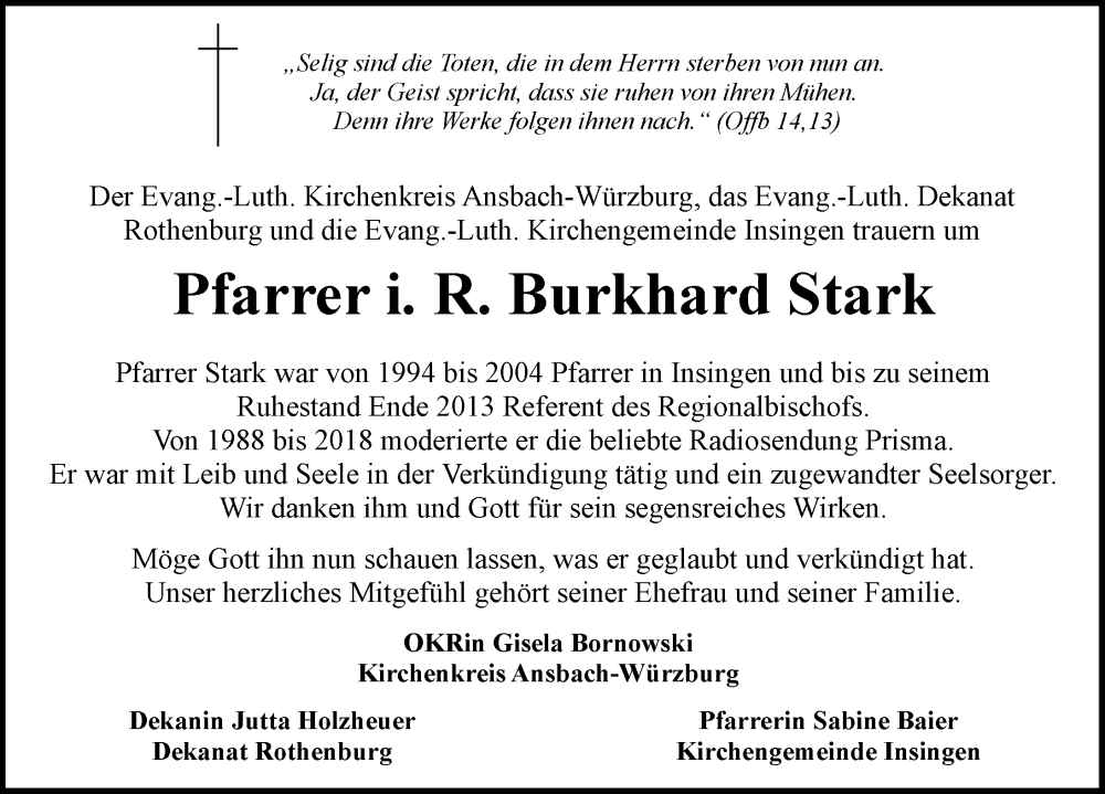Hier finden Sie alle Traueranzeigen aus der Zeitung, die bisher für Burkhard Stark erschienen sind. Weitere Traueranzeigen, die in der Zeitung erscheinen, werden hier ebenfalls aufgelistet