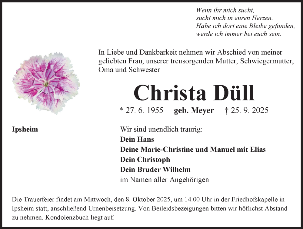Hier finden Sie alle Traueranzeigen aus der Zeitung, die bisher für Christa Düll erschienen sind. Weitere Traueranzeigen, die in der Zeitung erscheinen, werden hier ebenfalls aufgelistet