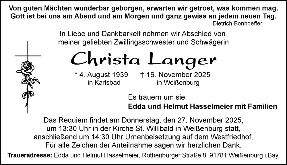 Hier finden Sie alle Traueranzeigen aus der Zeitung, die bisher für Christa Langer erschienen sind. Weitere Traueranzeigen, die in der Zeitung erscheinen, werden hier ebenfalls aufgelistet