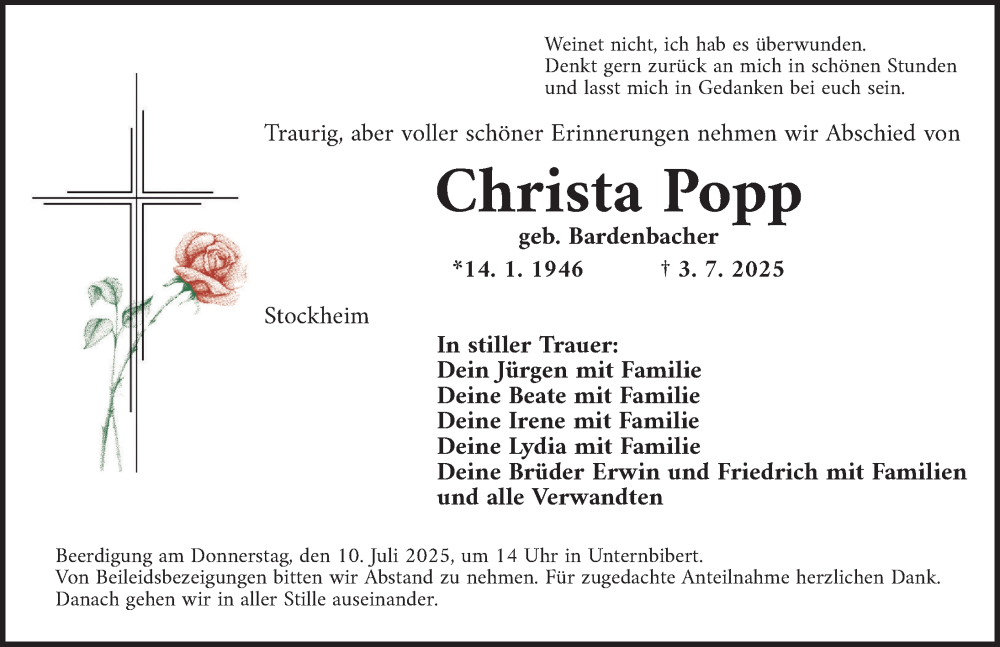 Hier finden Sie alle Traueranzeigen aus der Zeitung, die bisher für Christa Popp erschienen sind. Weitere Traueranzeigen, die in der Zeitung erscheinen, werden hier ebenfalls aufgelistet