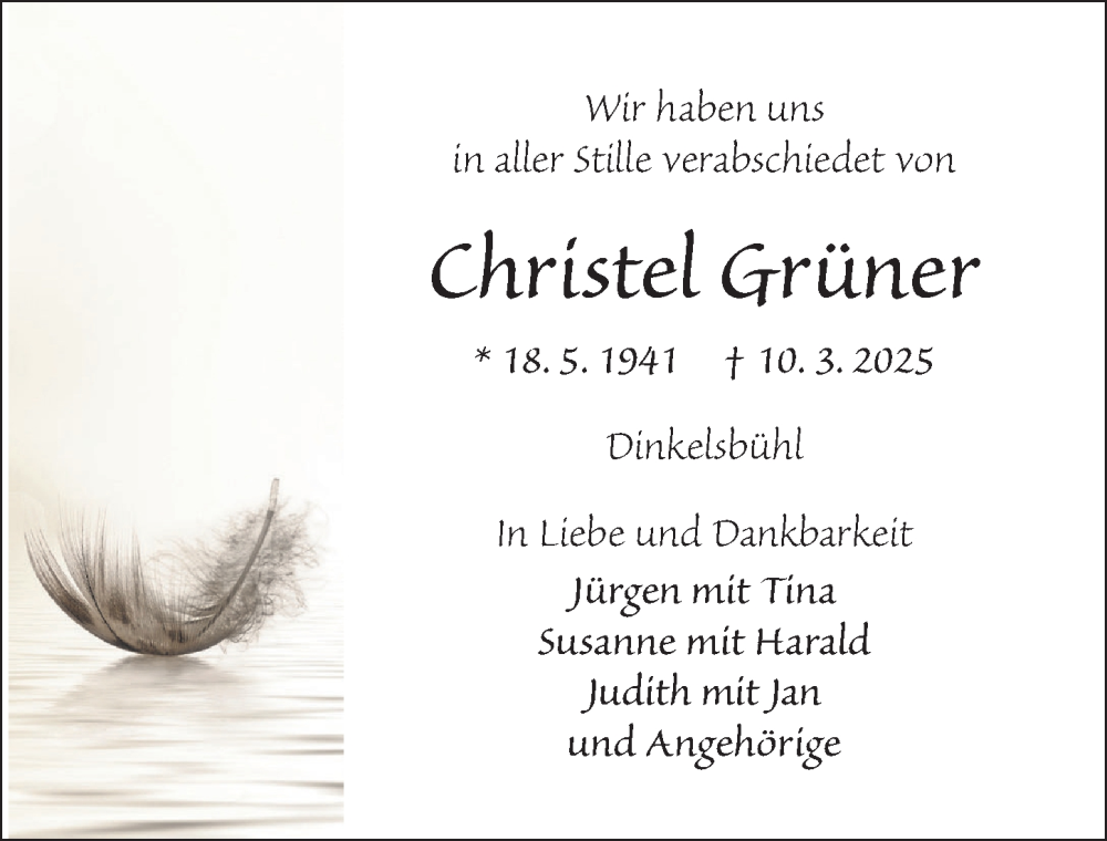 Hier finden Sie alle Traueranzeigen aus der Zeitung, die bisher für Christel Grüner erschienen sind. Weitere Traueranzeigen, die in der Zeitung erscheinen, werden hier ebenfalls aufgelistet