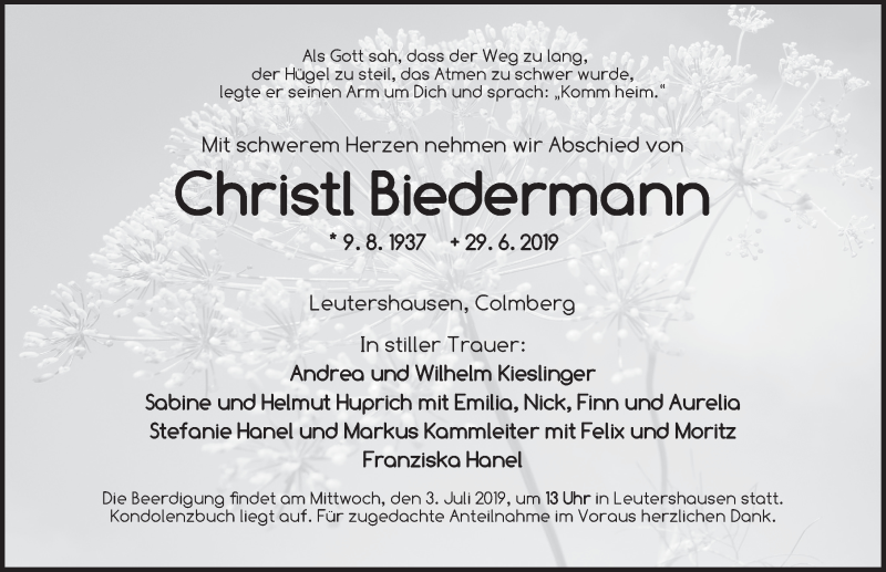 Hier finden Sie alle Traueranzeigen aus der Zeitung, die bisher für Christl Biedermann erschienen sind. Weitere Traueranzeigen, die in der Zeitung erscheinen, werden hier ebenfalls aufgelistet