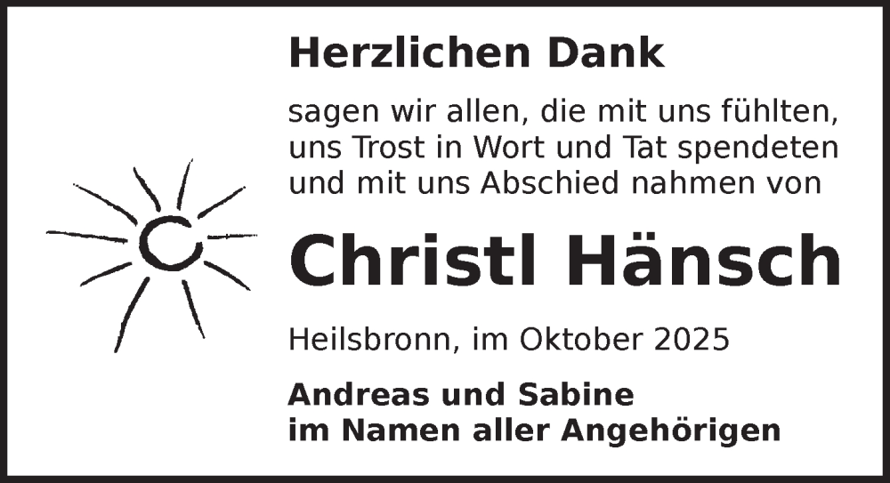 Hier finden Sie alle Traueranzeigen aus der Zeitung, die bisher für Christl Hänsch erschienen sind. Weitere Traueranzeigen, die in der Zeitung erscheinen, werden hier ebenfalls aufgelistet