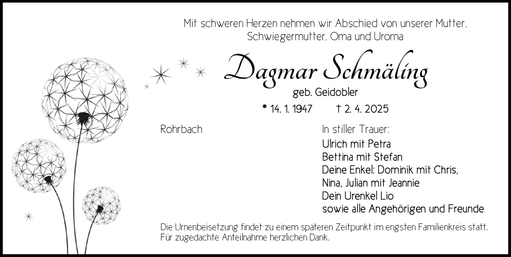 Hier finden Sie alle Traueranzeigen aus der Zeitung, die bisher für Dagmar Schmäling erschienen sind. Weitere Traueranzeigen, die in der Zeitung erscheinen, werden hier ebenfalls aufgelistet
