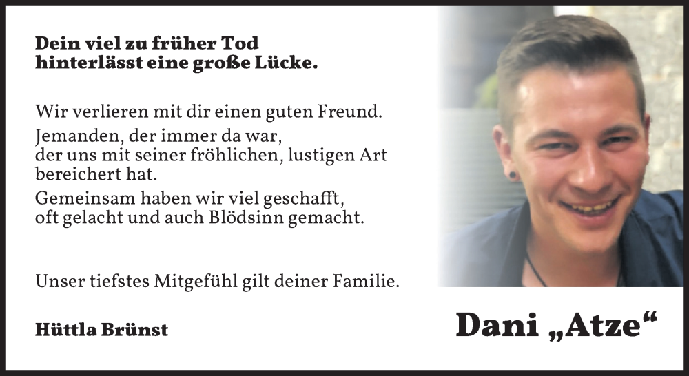 Hier finden Sie alle Traueranzeigen aus der Zeitung, die bisher für Dani erschienen sind. Weitere Traueranzeigen, die in der Zeitung erscheinen, werden hier ebenfalls aufgelistet