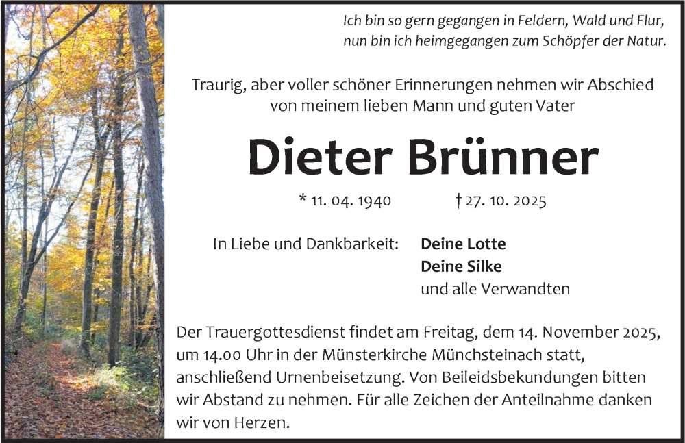 Hier finden Sie alle Traueranzeigen aus der Zeitung, die bisher für Dieter Brünner erschienen sind. Weitere Traueranzeigen, die in der Zeitung erscheinen, werden hier ebenfalls aufgelistet