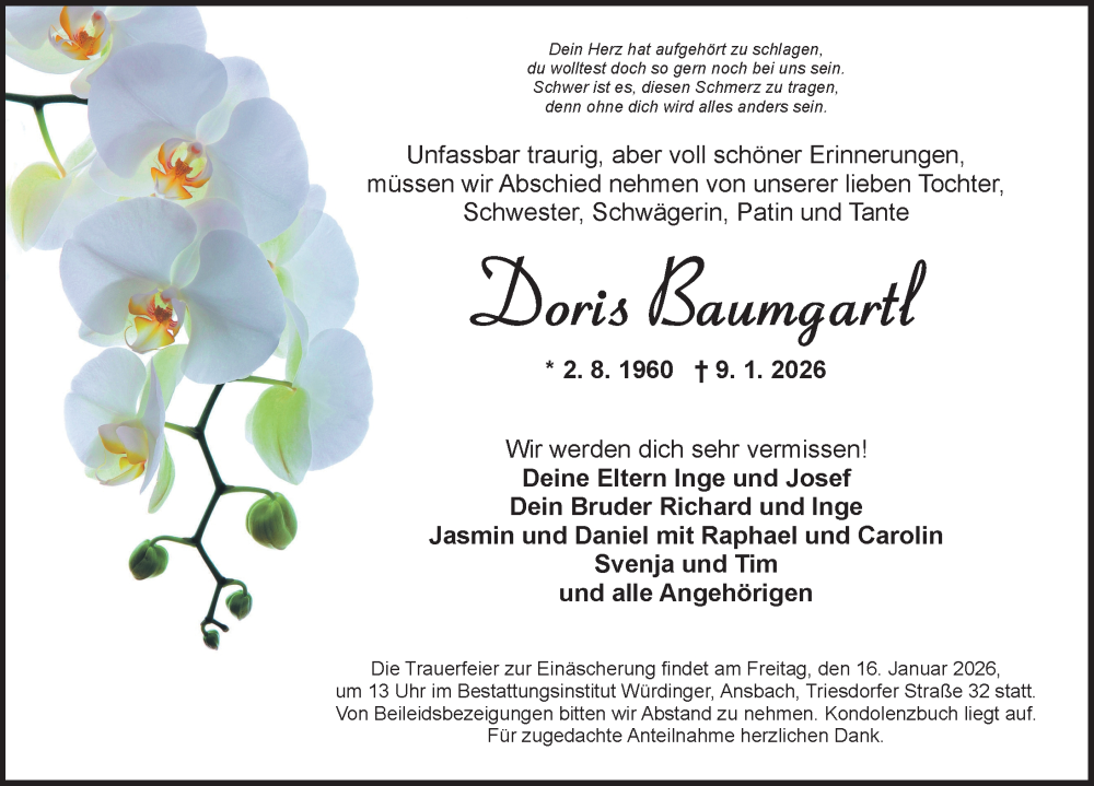 Hier finden Sie alle Traueranzeigen aus der Zeitung, die bisher für Doris Baumgartl erschienen sind. Weitere Traueranzeigen, die in der Zeitung erscheinen, werden hier ebenfalls aufgelistet