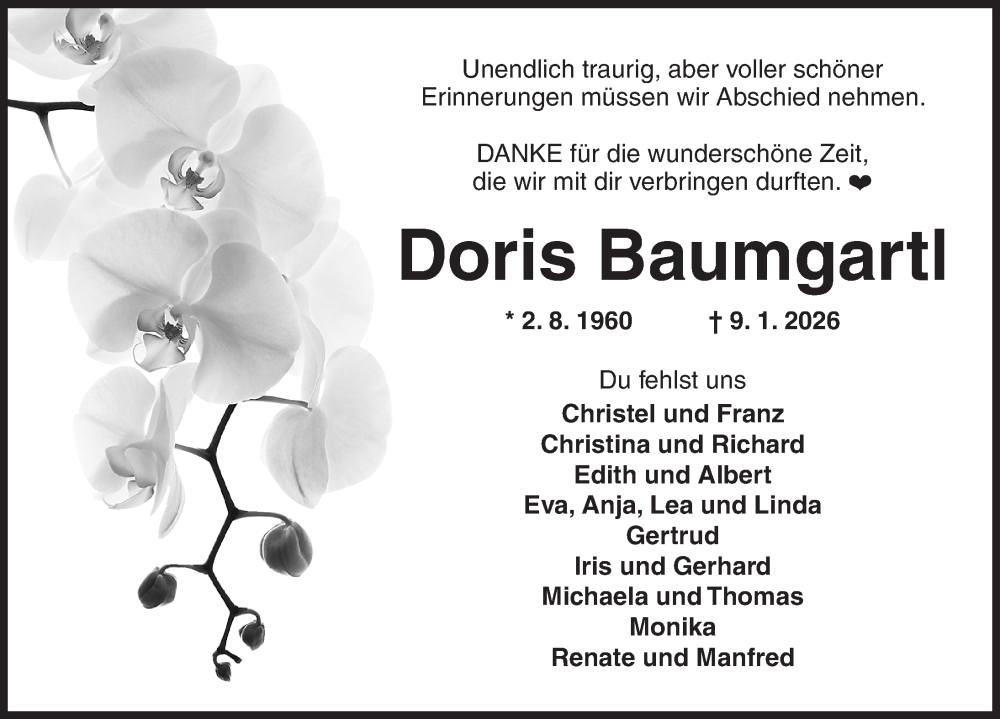 Hier finden Sie alle Traueranzeigen aus der Zeitung, die bisher für Doris Baumgartl erschienen sind. Weitere Traueranzeigen, die in der Zeitung erscheinen, werden hier ebenfalls aufgelistet