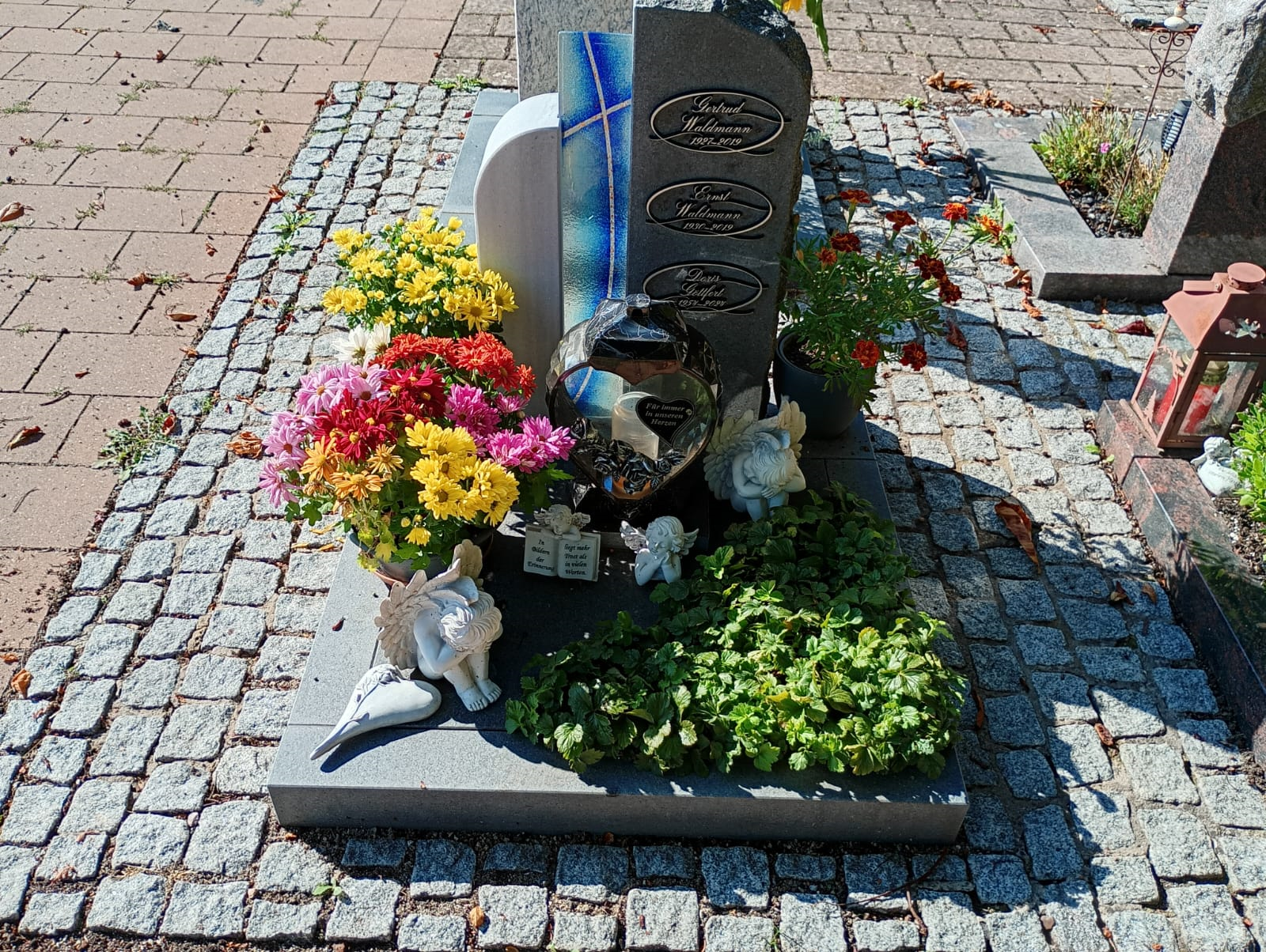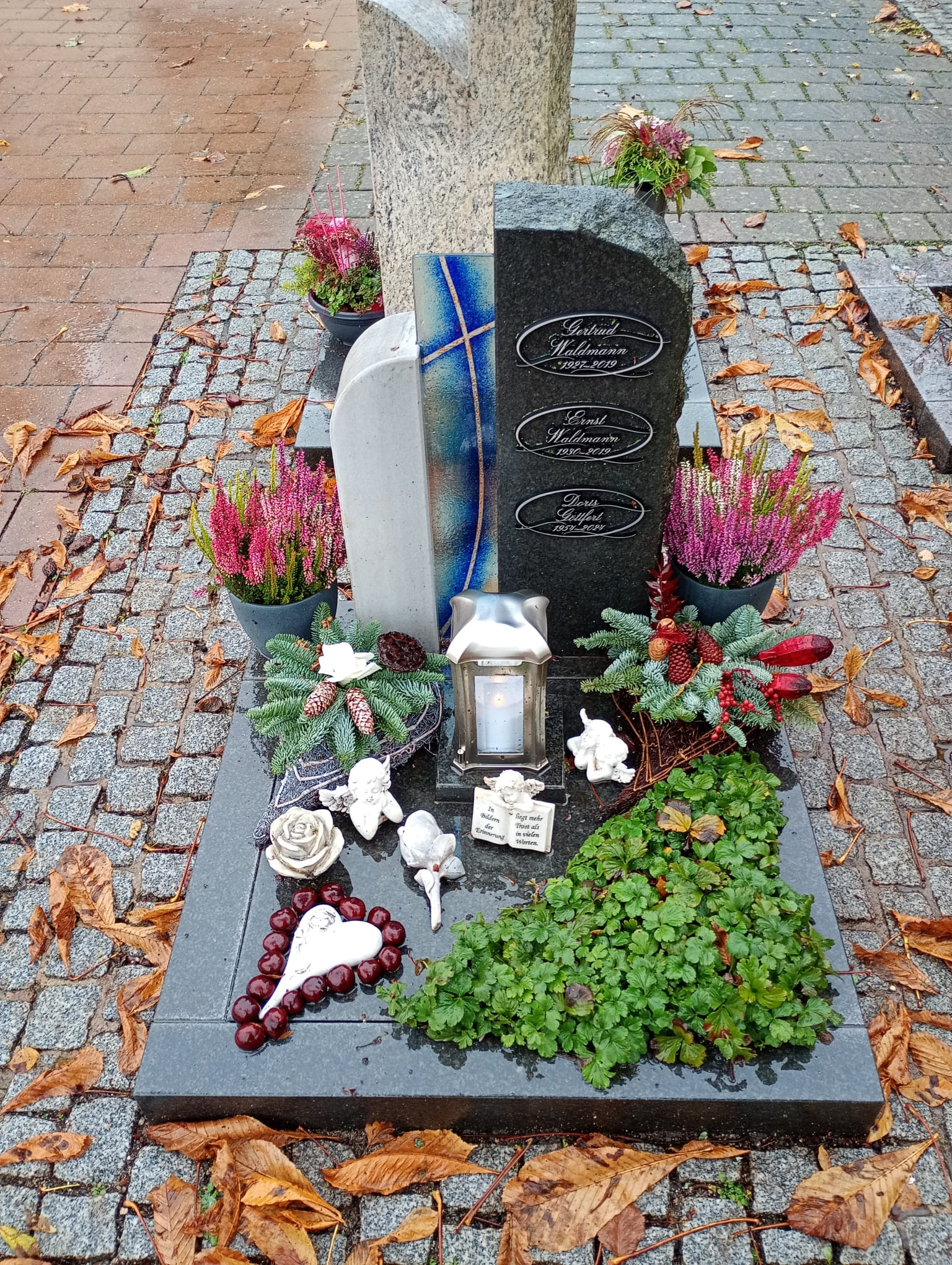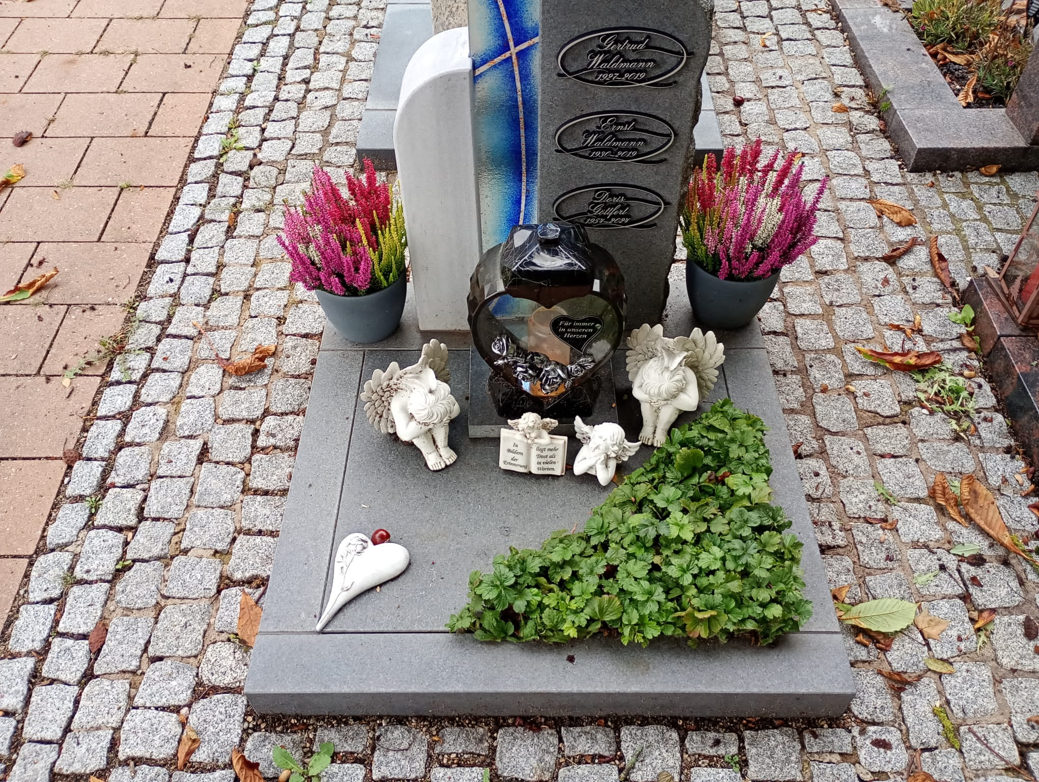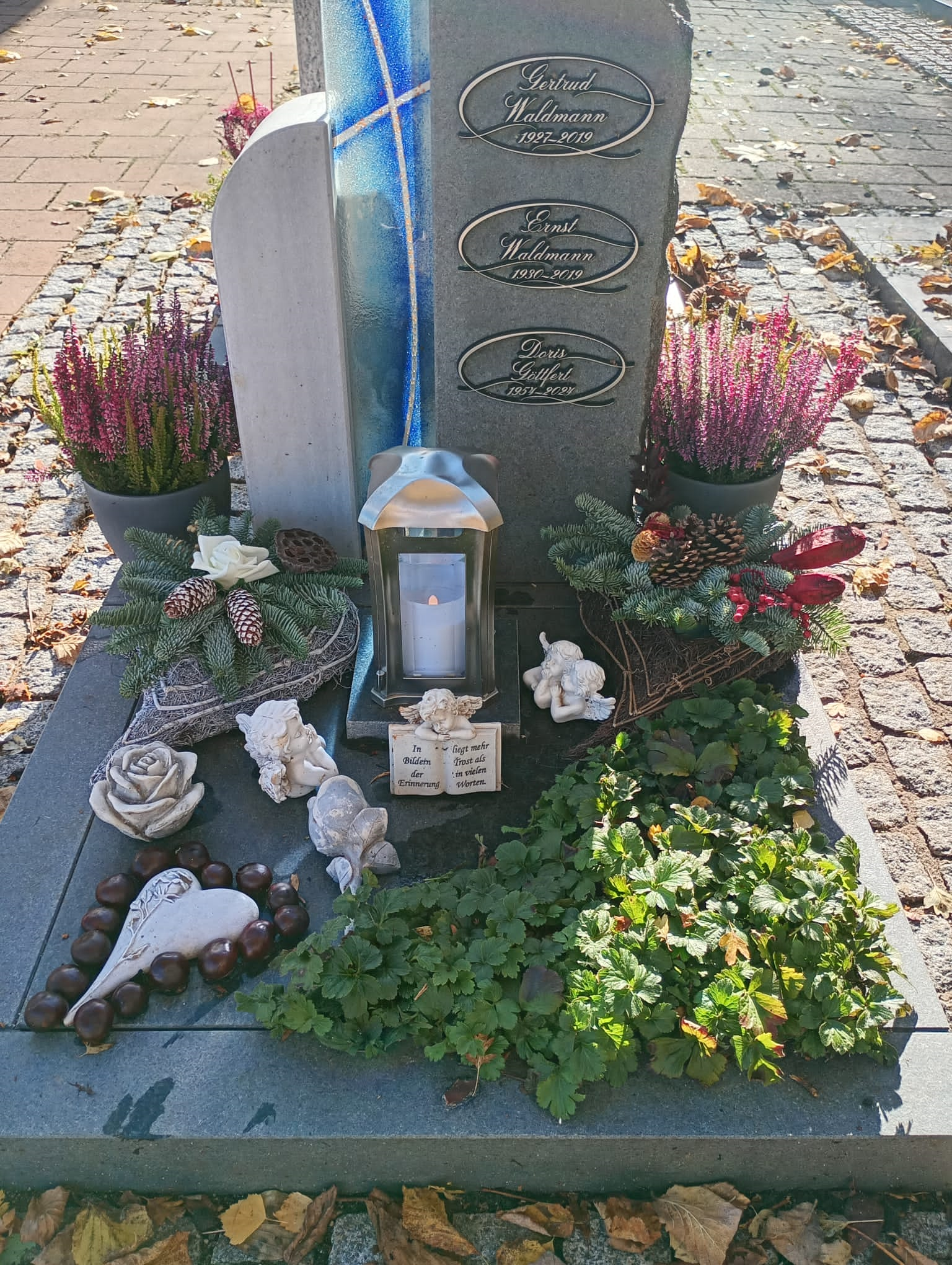Für Alle die auf diesem Weg das Grab besuchen möchten. #1 09.11. #2 30.10. mit neuem Winterschmuck #3 04.10. Herz aus Kastanien Rosen, neue Grabkerze #4 28.09. die erste Kastanie, letztes mal herzförmige Grabkerze #5 19.09. Calluna Blumentöpfen #6 12.09. die Blumen halten sich noch tapfer #7 06.09. zum 71-ten Abends #8 Mittags gelbe Chrysanthemen, Topf/Strauß #9 18.06. für unsere liebe Doris - zwei Ihrer lieben Sonnenblumen