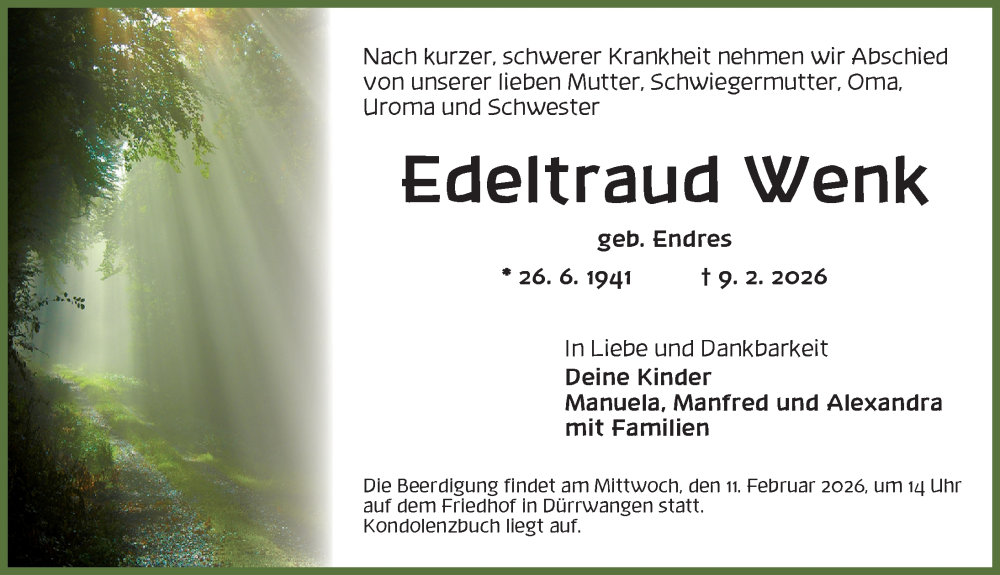Hier finden Sie alle Traueranzeigen aus der Zeitung, die bisher für Edeltraud Wenk erschienen sind. Weitere Traueranzeigen, die in der Zeitung erscheinen, werden hier ebenfalls aufgelistet