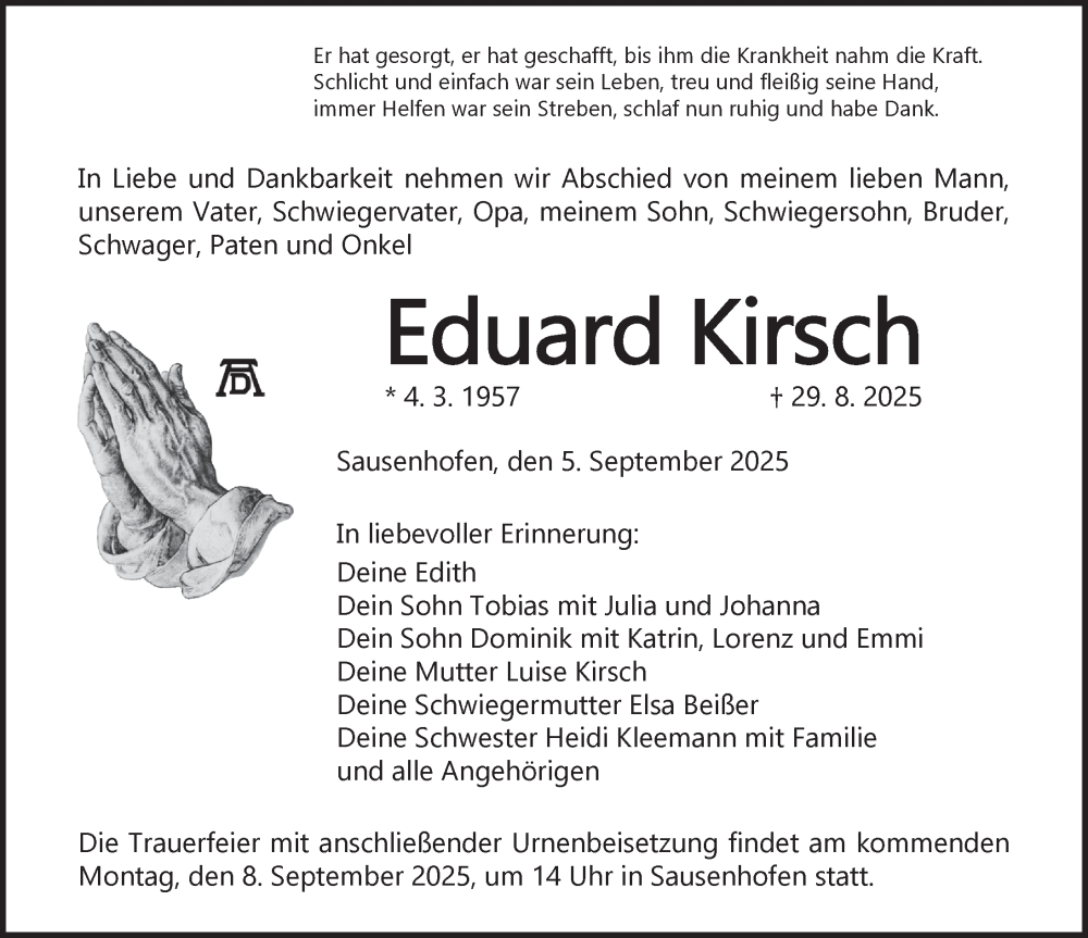 Hier finden Sie alle Traueranzeigen aus der Zeitung, die bisher für Eduard Kirsch erschienen sind. Weitere Traueranzeigen, die in der Zeitung erscheinen, werden hier ebenfalls aufgelistet