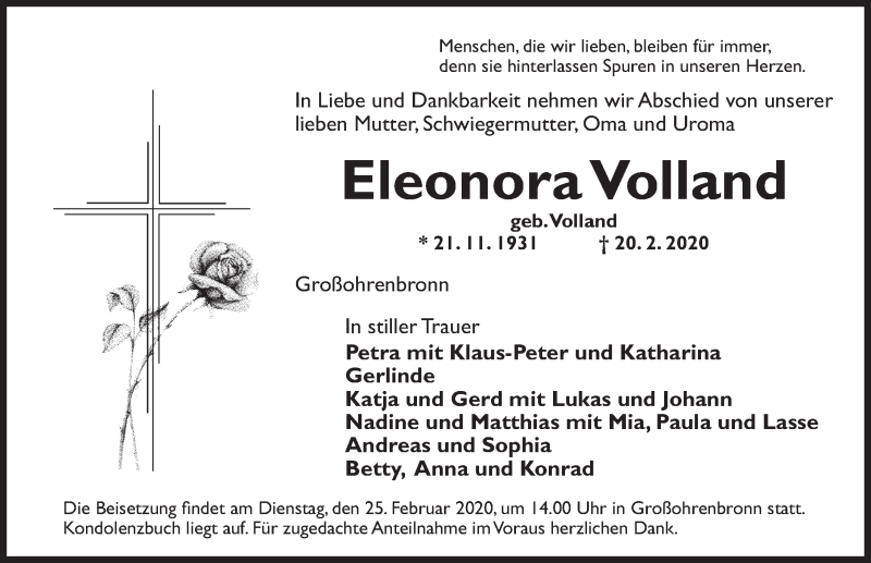 Hier finden Sie alle Traueranzeigen aus der Zeitung, die bisher für Eleonora Volland erschienen sind. Weitere Traueranzeigen, die in der Zeitung erscheinen, werden hier ebenfalls aufgelistet