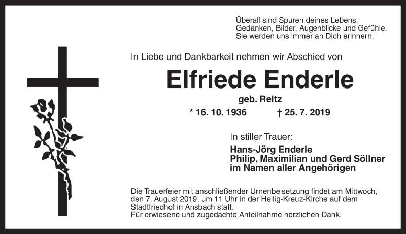Hier finden Sie alle Traueranzeigen aus der Zeitung, die bisher für Elfriede Enderle erschienen sind. Weitere Traueranzeigen, die in der Zeitung erscheinen, werden hier ebenfalls aufgelistet
