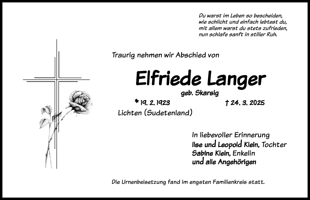 Hier finden Sie alle Traueranzeigen aus der Zeitung, die bisher für Elfriede Langer erschienen sind. Weitere Traueranzeigen, die in der Zeitung erscheinen, werden hier ebenfalls aufgelistet