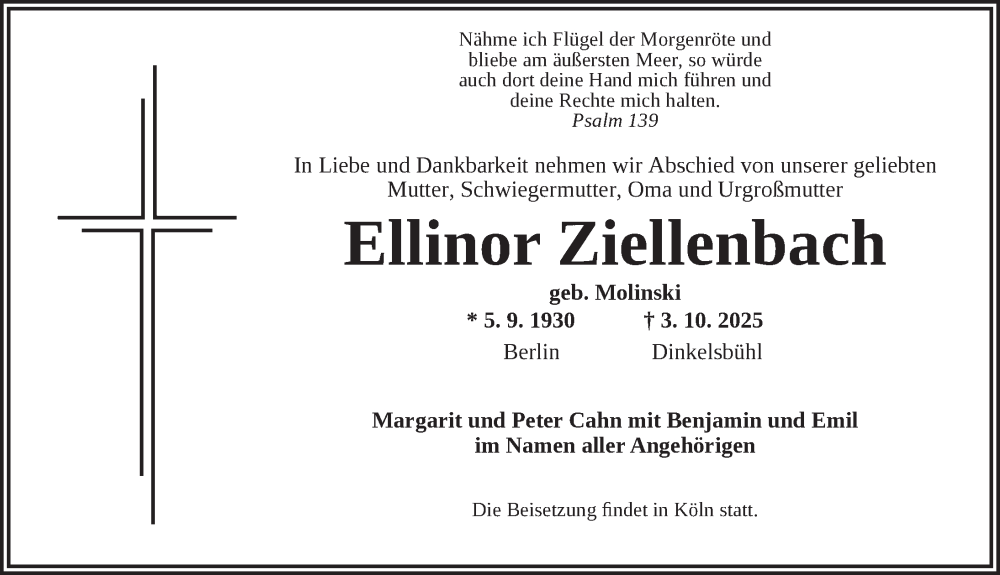 Hier finden Sie alle Traueranzeigen aus der Zeitung, die bisher für Ellinor Ziellenbach erschienen sind. Weitere Traueranzeigen, die in der Zeitung erscheinen, werden hier ebenfalls aufgelistet
