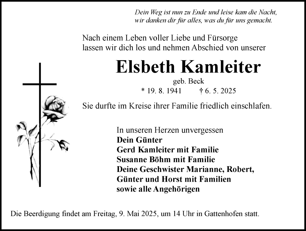 Hier finden Sie alle Traueranzeigen aus der Zeitung, die bisher für Elsbeth Kamleiter erschienen sind. Weitere Traueranzeigen, die in der Zeitung erscheinen, werden hier ebenfalls aufgelistet