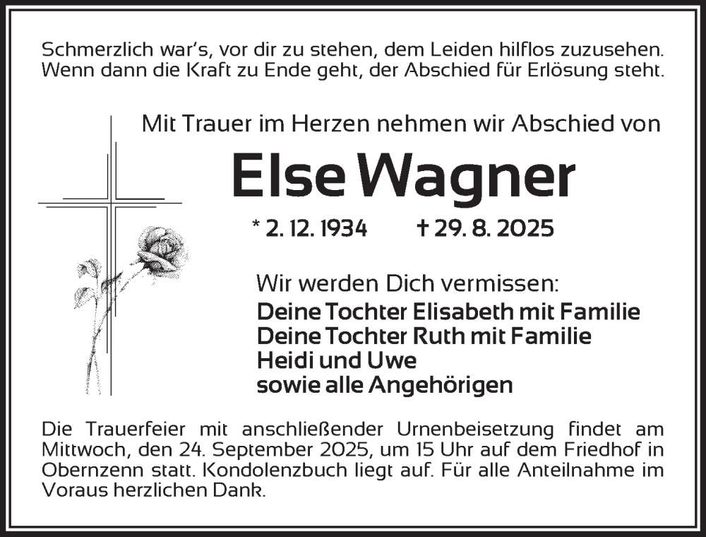 Hier finden Sie alle Traueranzeigen aus der Zeitung, die bisher für Else Wagner erschienen sind. Weitere Traueranzeigen, die in der Zeitung erscheinen, werden hier ebenfalls aufgelistet