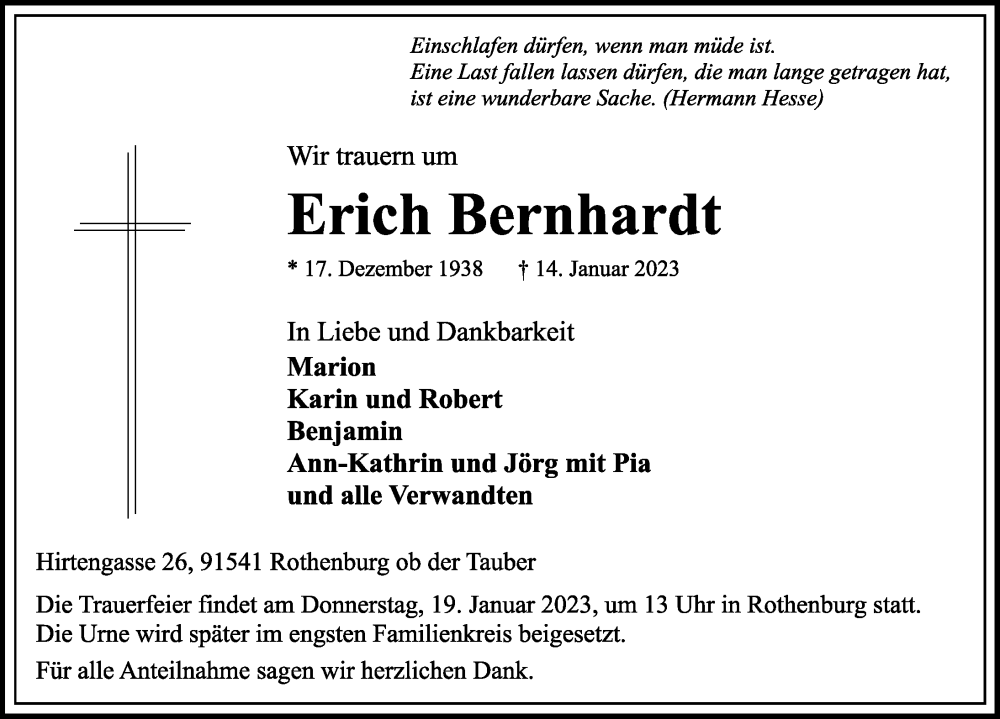 Hier finden Sie alle Traueranzeigen aus der Zeitung, die bisher für Erich Bernhardt erschienen sind. Weitere Traueranzeigen, die in der Zeitung erscheinen, werden hier ebenfalls aufgelistet