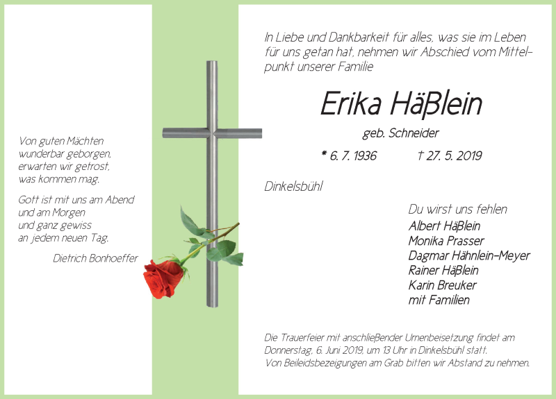 Hier finden Sie alle Traueranzeigen aus der Zeitung, die bisher für Erika Häßlein erschienen sind. Weitere Traueranzeigen, die in der Zeitung erscheinen, werden hier ebenfalls aufgelistet