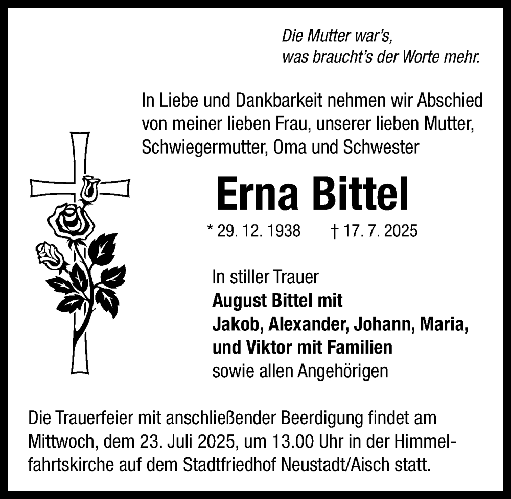 Hier finden Sie alle Traueranzeigen aus der Zeitung, die bisher für Erna Bittel erschienen sind. Weitere Traueranzeigen, die in der Zeitung erscheinen, werden hier ebenfalls aufgelistet